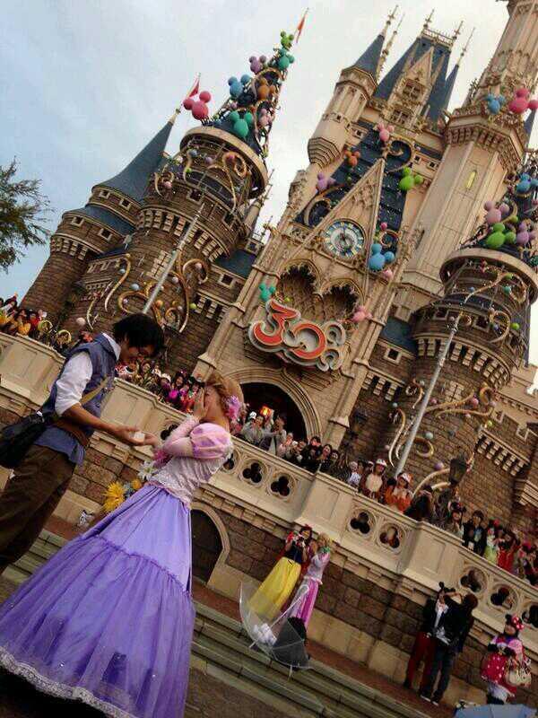 ちょちょ 昨日のディズニーで初めてプロポーズしてるカップル みた しかも2組も 幸せ分けてもらえた O ゚ ゚ O これはラプンツェルの仮装してたカップルさんたち Http T Co Pcec3ioulc